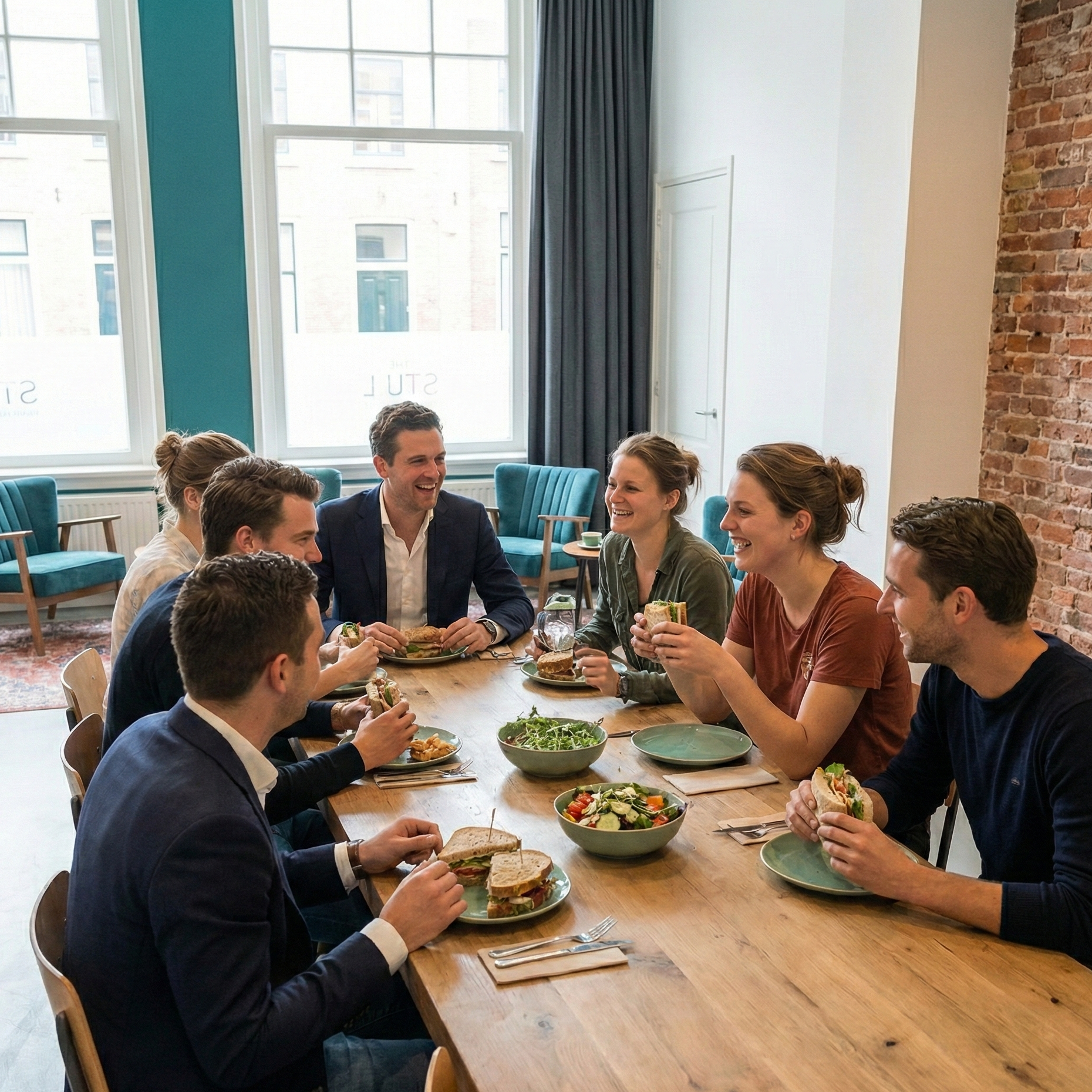 Een gezonde gezamenlijke lunch voor de 'Stillers' die gezellig samen willen komen. Aan de grote lunchtafel kunnen we lekker eten, ontspannen en onze onderlinge band versterken.